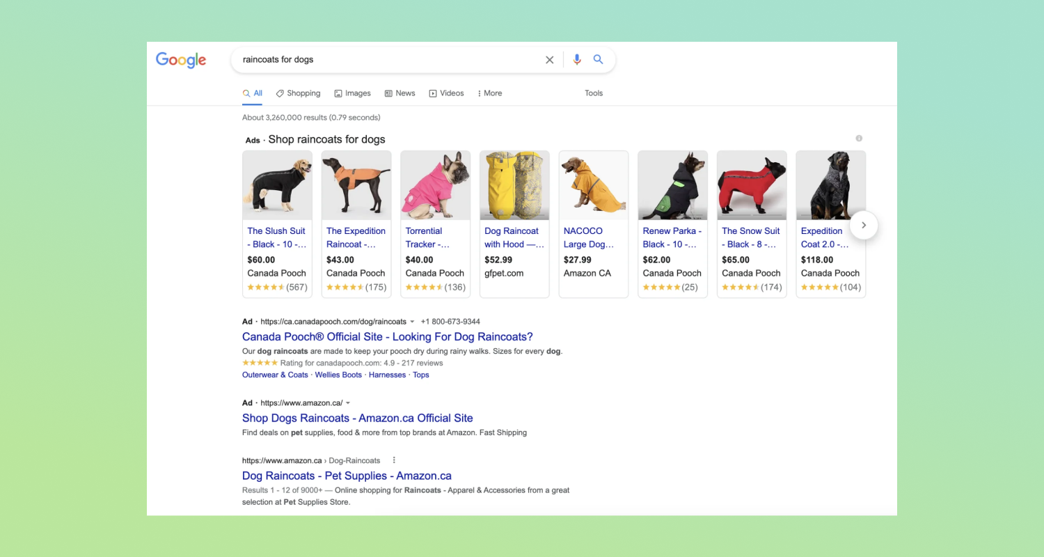 Informational keyword searchers are looking for answers, guides, and explanations. Blogs and content-heavy sites care most about these keywords. Shopify stores and other ecommerce sites have blogs too, but they also target keywords that show buying intent, like “raincoats for dogs.”