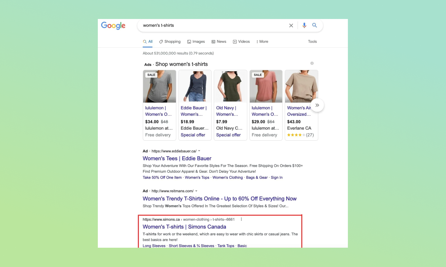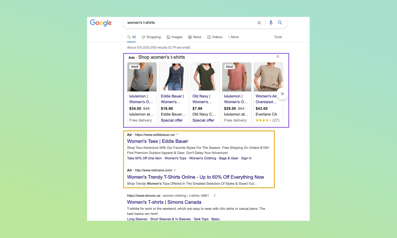 These organic results appear below paid ads (orange) and Google Shopping ads (purple):