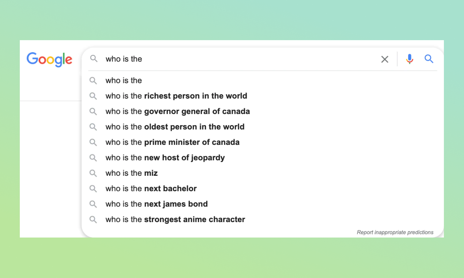 When you start to type a search query into Google, its autocomplete feature suggests relevant queries: